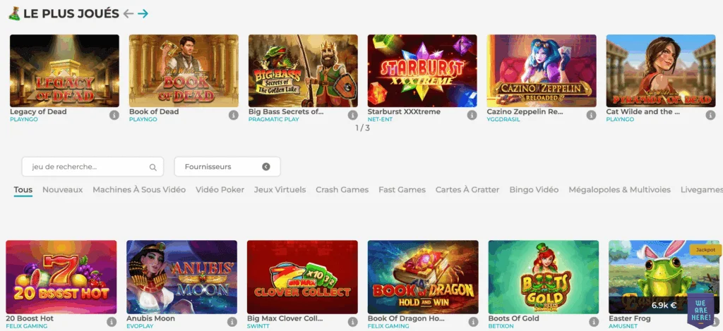 Types de jeuxSlots, jackpot slots, jeux de table, live casino, scratch cards, sportsbook
