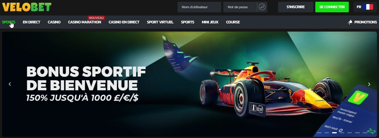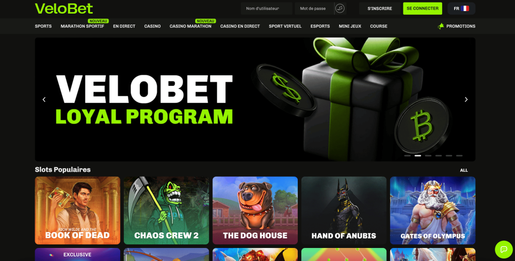 Velobet propose des machines à sous, des jeux de table, du live casino, des jackpots progressifs, des mini-jeux et une section paris sportifs.