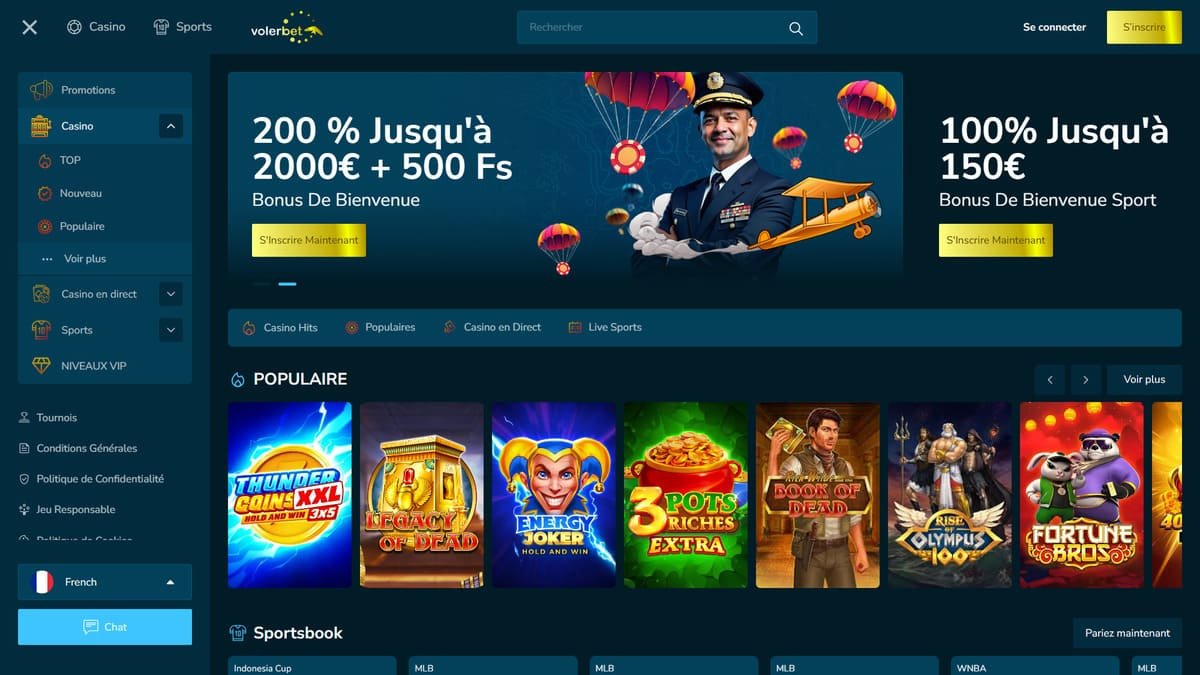 Volerbet se présente comme un site multi-usage. Le casino n’est pas isolé dans un coin de la plateforme : il est intégré à un environnement plus large avec des paris sportifs, un espace promotions, un programme VIP, des tournois et une logique de rétention assumée. Cela donne immédiatement une impression plus solide qu’un simple opérateur “bonus first”.